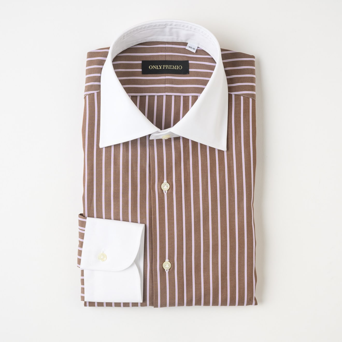 ≪WEB新作≫PREMIO/綿100%/クレリックシャツ/イタリアンレギュラー/ブラウン/ストライプ/シャツ