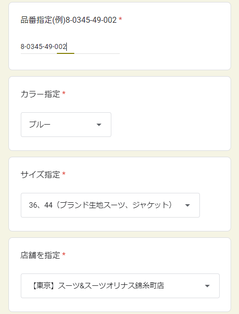 (例)通常スーツの場合は165Y等、ブランド生地スーツの場合は36や44等4店舗の指定